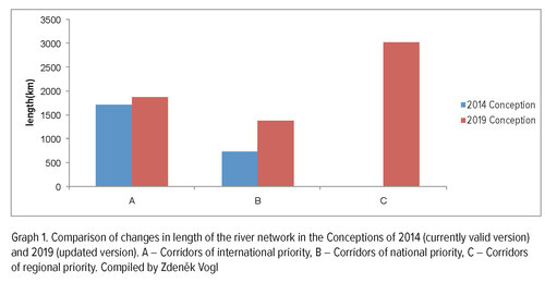 Before each stage in water management planning, it is necessary to revise all relevant documents, add current knowledge and update them with newly available data. Besides a selection of priority watercourses, especially for distant migrants, the updated version of the Conception takes territorial and species protection based on national and European legislation into account in a comprehensive way (see Fig. 1). For these reasons, nearly a doubling of national corridors and definition of a completely new category, Category C, for watercourses (or sections of them) of regional importance have been achieved. A numeric comparison of changes in the currently valid and updated version of the Conception is illustrated in Graphs 1 and 2.
