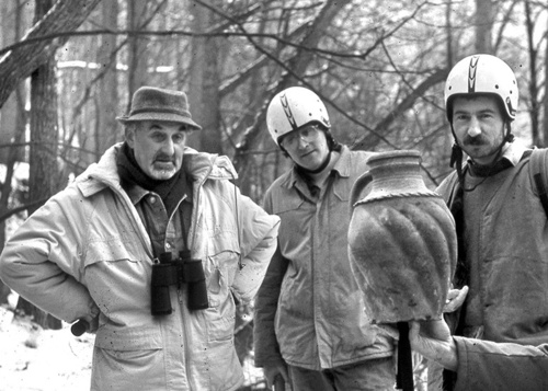 Vladimír Hanák byl v rámci zimního sčítání netopýrů v Ledových slujích u Vranova nad Dyjí přítomen nálezu historického džbánu v jedné z podzemních prostor. Kromě prof. Hanáka je na snímku Petr Lazárek (uprostřed) a Martin Mahr, oba ze strážní služby NP Podyjí. 28. ledna 1993. Foto Antonín Reiter