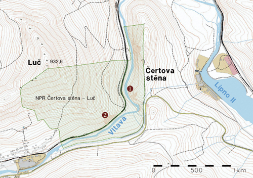 Národní přírodní rezervace Čertova stěna – Luč. 1. Vlastíkova jeskyně, 2. Bonsajová jeskyně Podklad © ČÚZK a AOPK ČR, 2011