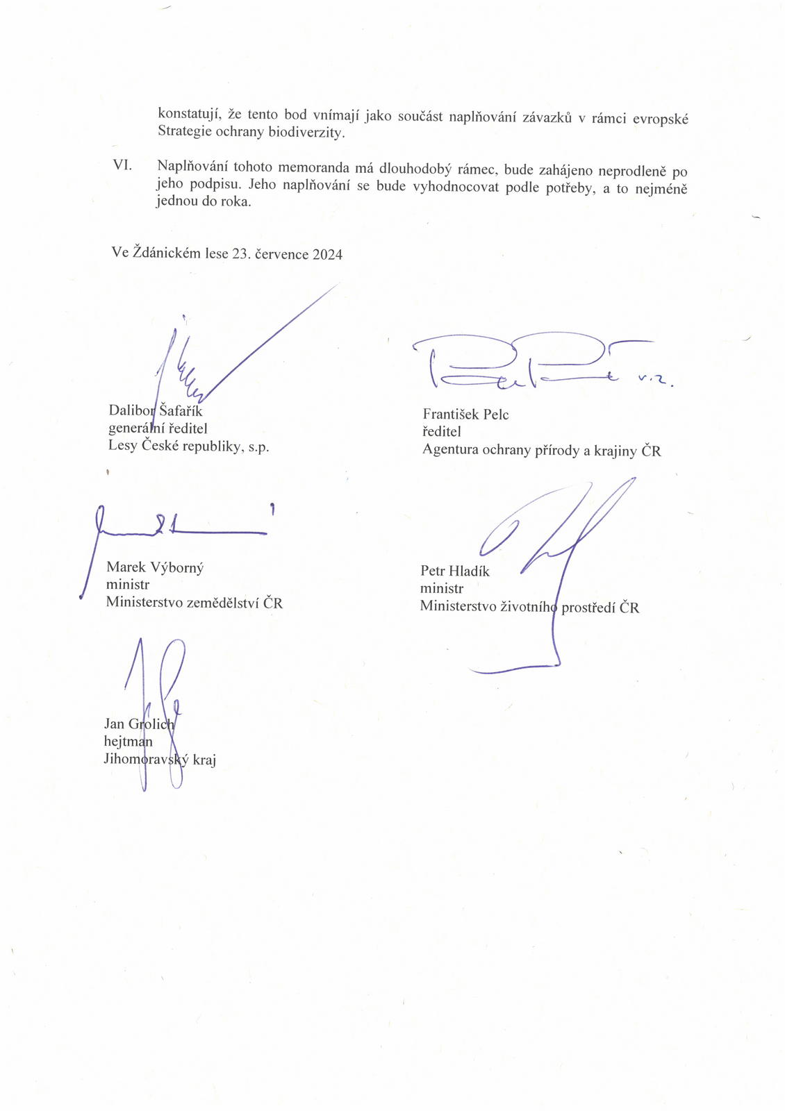 AOPK ČR na základě vlastních dat a jejich aktualizace v terénu (Hájek 2024) zpracovala odborný dokument (Hubená a kol. 2024), který se stal podkladem pro jednání o memorandu vedeném generálním ředitelem státního podniku Lesy ČR Daliborem Šafaříkem a ředitelem AOPK ČR Františkem Pelcem. Po projednání v Radě Jihomoravského kraje, ve vedení obou resortů a po seznámení představitelů místních samospráv s jeho obsahem bylo memorandum 23. července 2024 přímo ve Ždánickém lese podepsáno. Signatáři memoranda jsou Ministerstvo životního prostředí, Ministerstvo zemědělství, Jihomoravský kraj, státní podnik Lesy ČR a Agentura ochrany přírody a krajiny ČR.