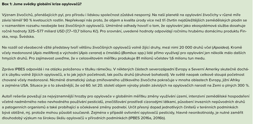 nách podílelo 77 autorů, kteří prostudovali 2 000 recenzovaných zdrojů. Text prošlo na 280 recenzentů a redaktoři jednotlivých kapitol museli vypořádat na 10 300 připomínek. Protože je zřejmé, že ti, kteří rozhodují, nemohou tak obsáhlé sdělení číst, připravil pro ně autorský kolektiv mnohem hutnější shrnutí zprávy. A právě zmiňovaný výtah se stal předmětem debat, které se protáhly do pozdních nočních hodin. Základní zjištění o stavu opylovačů v globálním ekosystému přibližuje box 1.
