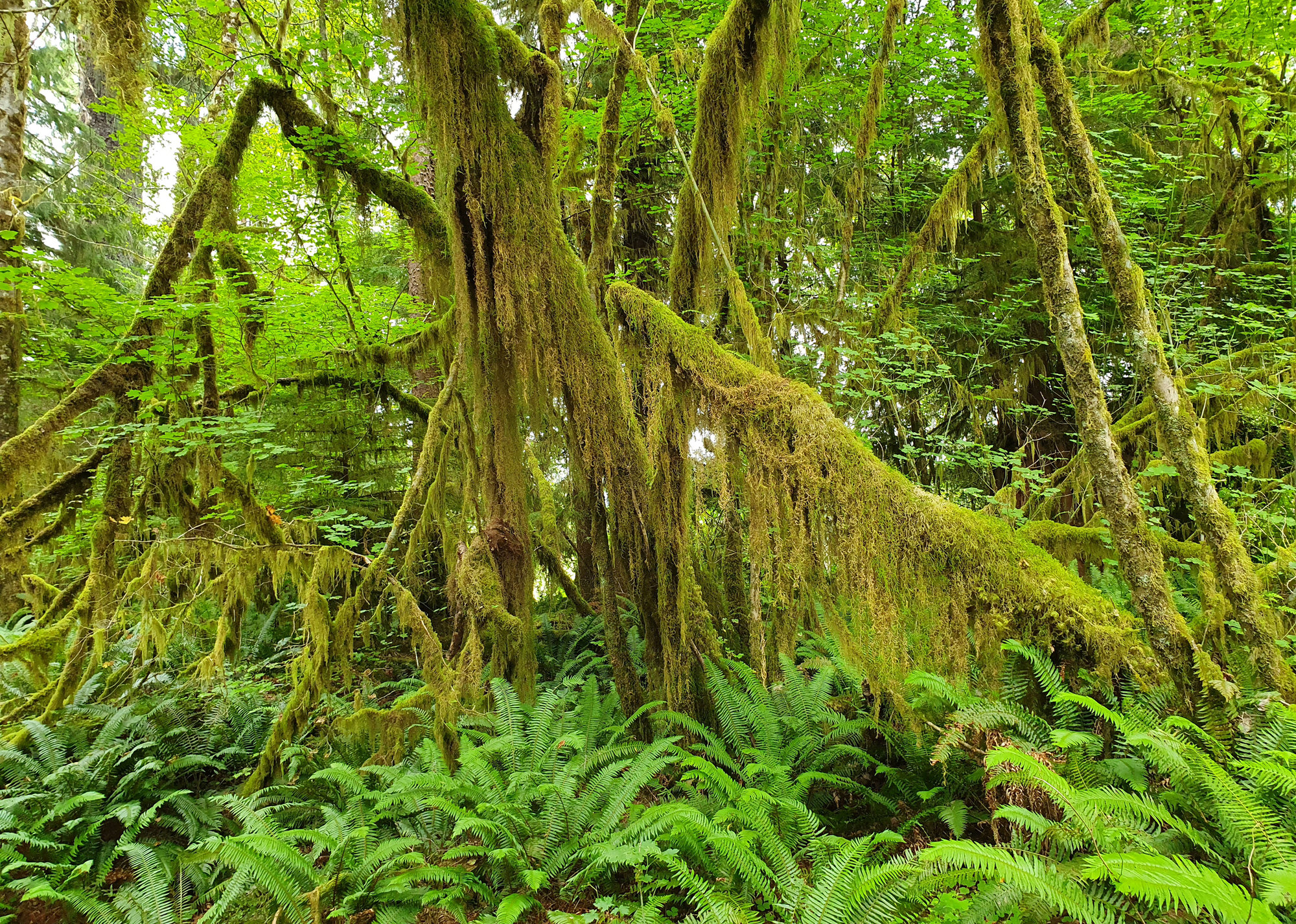Pralesy mají vysoké zastoupení jehličnanů, především mohutného smrku sitky, jedlovce západního, douglasky a zeravu obrovského. Stromy v nich zde dosahují vskutku mohutných rozměrů. Díky vytrvale deštivému počasí a mlze doslova obalují kmeny a větve dřevin mechorosty a lišejníky vytvářející skutečné závěsy. Na hluboké vrstvě rozkládající se organické hmoty dominují kapradiny, které se dokážou uchytit i vysoko v korunách stromů.
