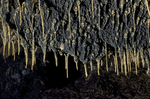 Mangano-hydroxidové stalaktity jeskyně Emile Racovita (Zoluška) v Moldavsku.