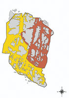Základní zonace chráněného území Wadi Rum: oranžová – divočina; šedá – hory; tmavohnědá – intenzivně využívaná zóna