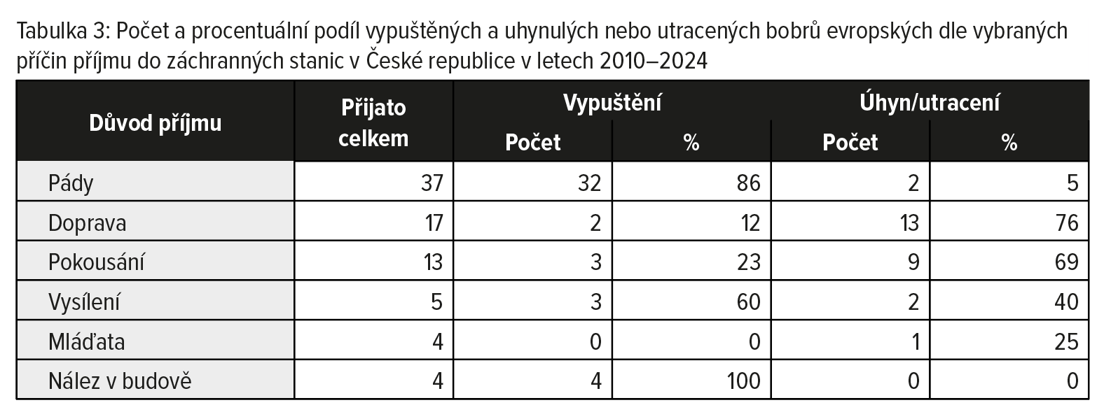 Tabulka 3: Počet a procentuální podíl vypuštěných a uhynulých nebo utracených bobrů evropských dle vybraných příčin příjmu do záchranných stanic v České republice v letech 2010–2024