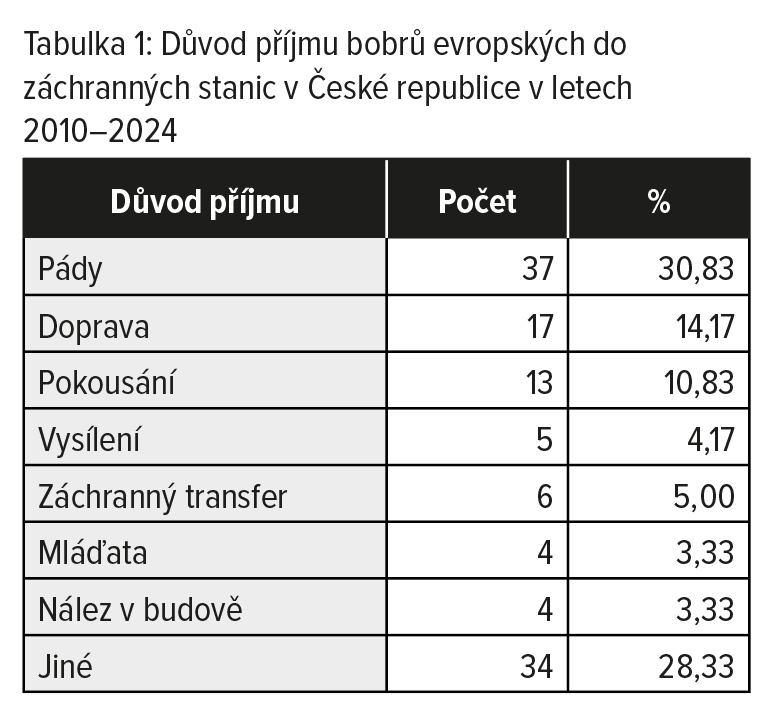 Tabulka 1: Důvod příjmu bobrů evropských do záchranných stanic v České republice v letech 2010–2024