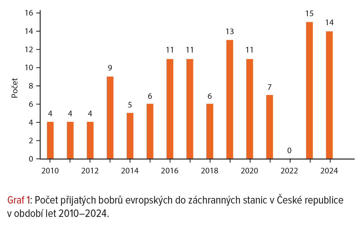 Graf 1: Počet přijatých bobrů evropských do záchranných stanic v České republice v období let 2010–2024.