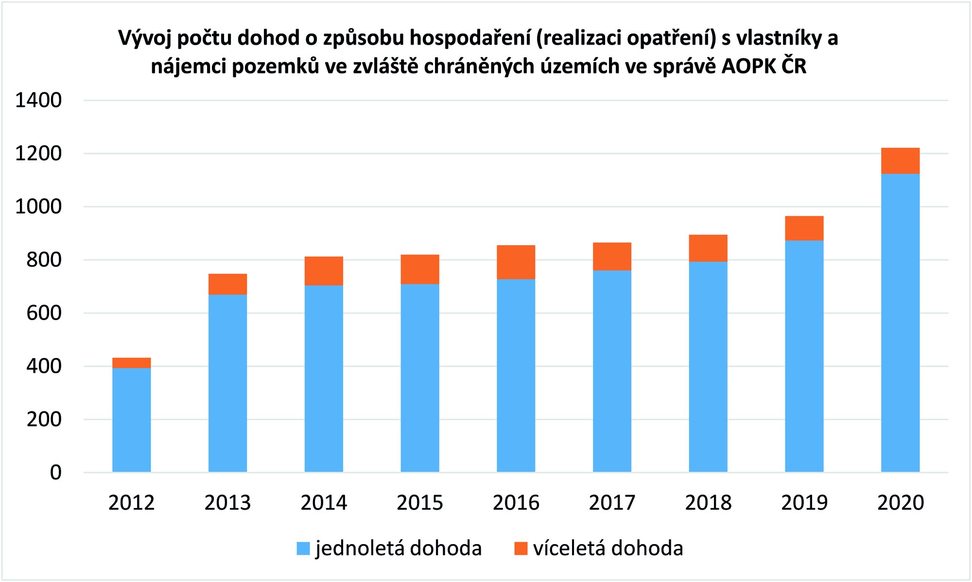 V současnosti AOPK ČR uzavírá přes 1100 těchto dohod ročně a kolem sta dohod je uzavřeno jako dlouhodobých (až na deset let). Počet veřejnoprávních smluv každoročně narůstá (viz graf č. 1).