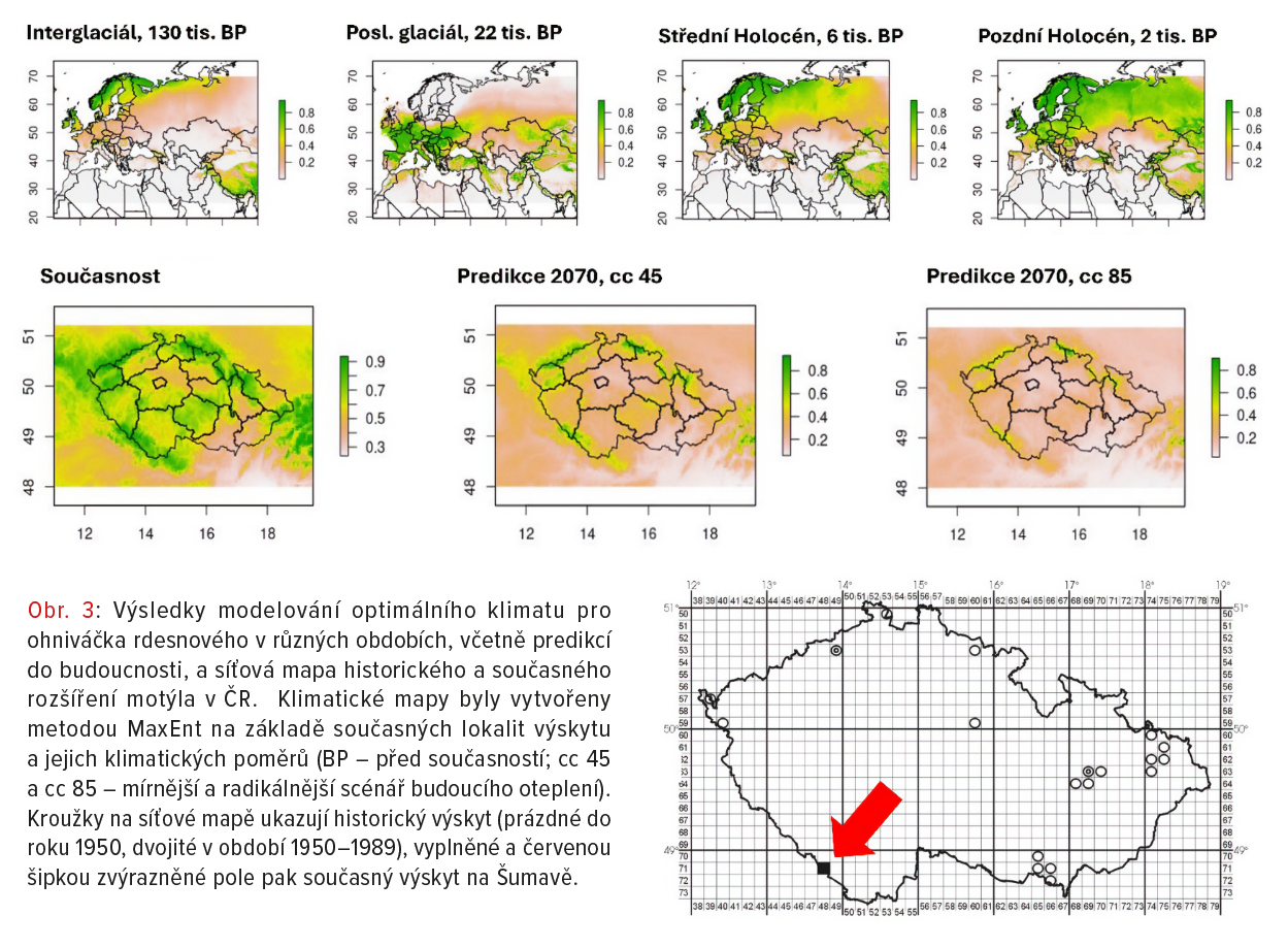 Obr. 3: Výsledky modelování optimálního klimatu pro ohniváčka rdesnového v různých obdobích, včetně predikcí do budoucnosti, a síťová mapa historického a současného rozšíření motýla v ČR. Klimatické mapy byly vytvořeny metodou MaxEnt na základě současných lokalit výskytu a jejich klimatických poměrů (BP – před současností; cc 45 a cc 85 – mírnější a radikálnější scénář budoucího oteplení). Kroužky na síťové mapě ukazují historický výskyt (prázdné do roku 1950, dvojité v období 1950–1989), vyplněné a červenou šipkou zvýrazněné pole pak současný výskyt na Šumavě.