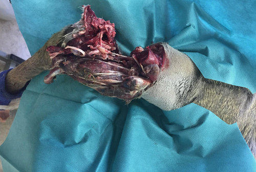 Poranění nohy srnce po sražení autem v době novoročního ohňostroje 2019.