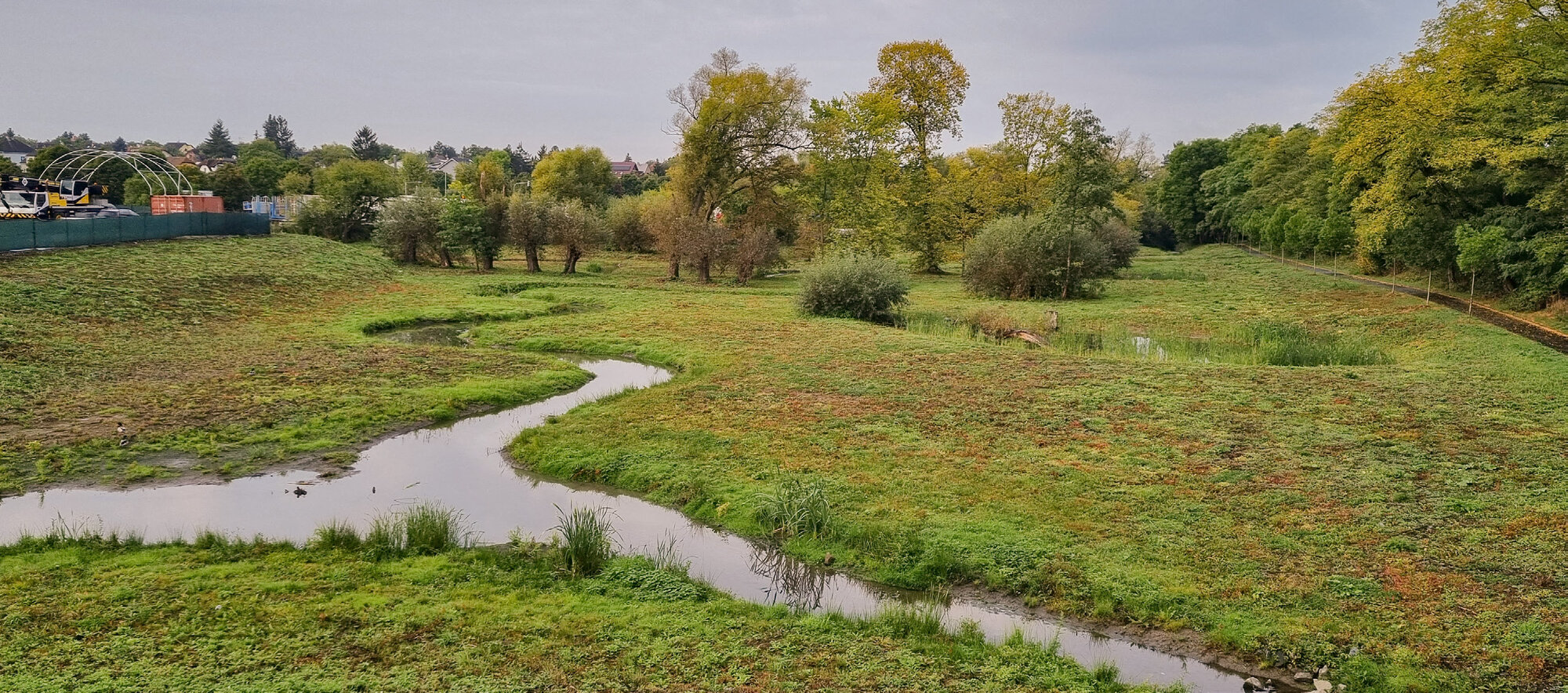 Obr. 1: VKP niva toku a tok jsou často součástí kostry intravilánové zeleně, jádrové části se většinou rovnají nezastavěným částem těchto VKP ex lege. Na snímku říčka Rokytka v Praze a její niva po revitalizaci. Foto Pavel Pešout