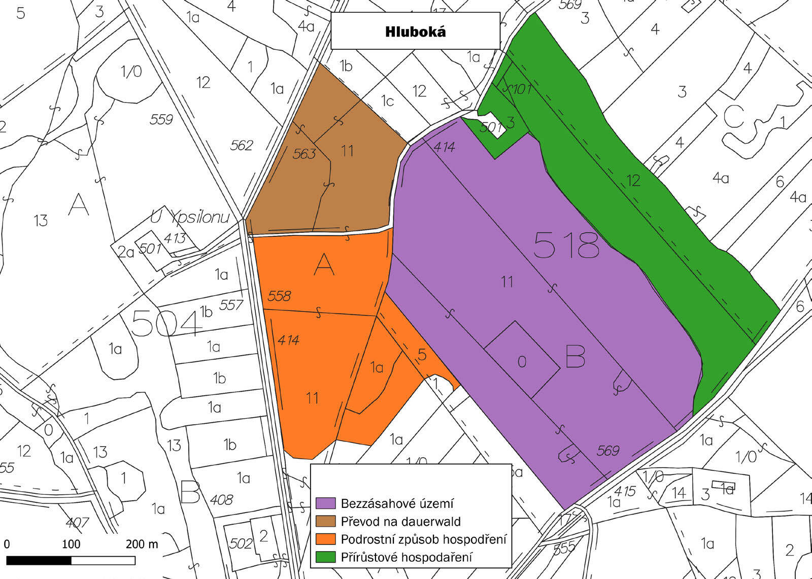 Obr. 4: Jako podklad pro lesní hospodářský plán v území VKP Ždánický les byly vymezeny jádrové části VKP na základě analýzy mapování biotopů, nálezové databáze ochrany přírody, údajů v LHP o stáří a druhovém složení porostů a po ověření aktuálního stavu v terénu. V každé jednotlivé jádrové části byl v dohodě s Lesy ČR, s. p., stanoven cílový stav přítomných biotopů a model hospodaření vhodný k jeho dosažení či udržení (maloplošné podrostní hospodářství, Dauerwald, přechodový Dauerwald, přírůstové hospodářství, střední les, pasečné hospodářství, bezzásahové porosty). Část ploch bylo navrženo k smluvní územní ochraně. Vymezené jádrové části tvoří přibližně pětinu plochy VKP Ždánický les. Jako ukázku zde publikujeme dvě z nich vč. vyznačení dohodnutých forem hospodaření. Originál Vladan Riedl