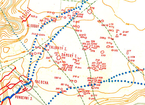 Výřez mapy závrtů Ostrovské plošiny Moravského krasu od P. Ryšavého z roku 1968.