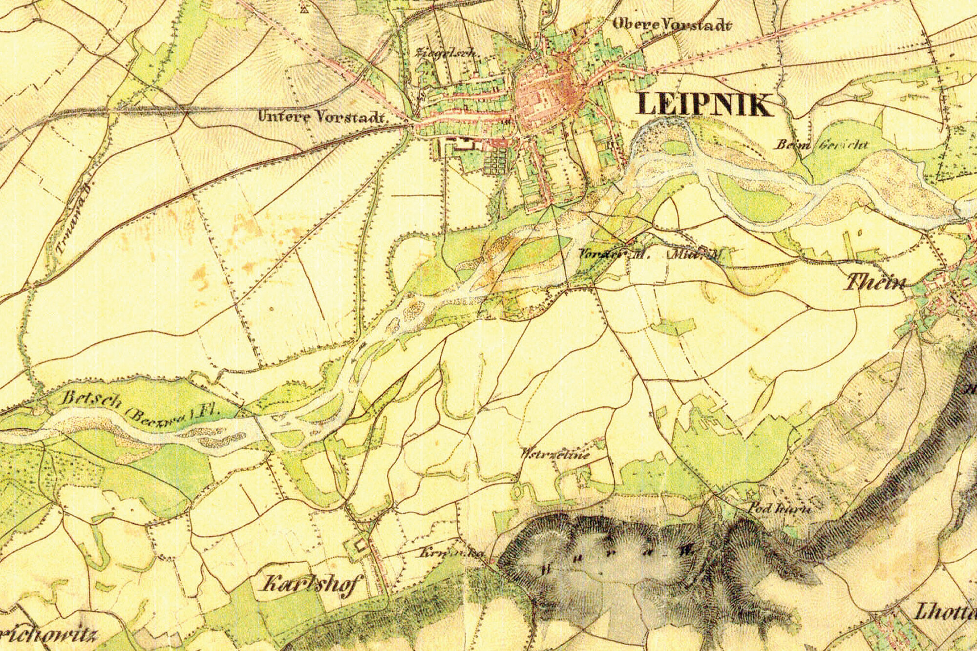 Pro téměř celý horní a střední úsek Bečvy bylo v době II. vojenskho mapování charakteristické štěrkonosné větvení. Na mapce část středního úseku Bečvy mezi Lipníkem a Osekem nad Bečvou v 1. pol. 19. stol. Zdroj: Mapy.cz