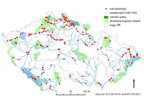 V rámci úkolu AOPK ČR „Pasportizace příčných objektů“ bylo v období září 2016 až leden 2017 provedeno pracovníky AOPK ČR a vybranými externími spolupracovníky (po dvouměsíčním zkušebním testování sběrových mobilních aplikací) vymapováno celkem 9605 migračních bariér na vodních tocích o celkové délce 11 458 ř. km. Dále bylo provedeno sledování dalších 3685 ř. km, které byly vyhodnoceny jako migračně nepotenciální, a to z různých důvodů (nedostatečný průtok, vysýchavost vodního toku, soustředění většího množství průtočných nádrží nebo rybníků apod.). I tyto vodní toky jsou však součástí databáze. Základní pohled na migrační překážky, jejich migrační prostupnost a obecně i na rozsah mapování lze dovodit z obrázku 4, „Aktuální stav migrační prostupnosti říční sítě na území ČR“. Lze konstatovat, že z uvedeného počtu migračních překážek bylo průchozích 2504. Migrační průchodnost zajišťovaly migračně prostupné objekty různého typu, jako jsou např. rybí přechody, balvanité skluzy, vodácké propusti aj., anebo byla překážka natolik poškozená, že byla samovolně průchozí. Celkem bylo vymapováno 2549 těchto objektů, z nichž bylo 241 rybích přechodů, viz obrázek 6, „Přehled rybích přechodů na zmapovaných vodních tocích“. V přiložených grafech na obr. 2 a 3 „Migrační bariéry“ a „Migračně prostupné objekty“ je znázorněn počet zjištěných jednotlivých typů bariér i migračně prostupných objektů.