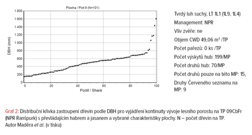 Ukazatelem kontinuity vývoje porostů je zastoupení dřevin podle průměru ve výčetní výšce (DBH) vyjádřené distribučními křivkami, jak je uvedeno v grafech (Graf 1–3). V ideálním případě by měly být tyto křivky plynulé. Příkladem dvou typů kontinuity ve vývoji porostu jsou křivky pro měkký luh (Graf 1) a pro TP v NPR Ranšpurk (Graf 2). Příklad narušené kontinuity ve vývoji lesního porostu těžbou na TP 06QrFr představuje Graf 3. Ke grafům jsou v rámečku doplněny další parametry TP, které ovlivňují druhovou skladbu hub vázaných na dřevo – objem tlejícího dřeva, počet zaznamenaných pařezů a vliv oborní zvěře.