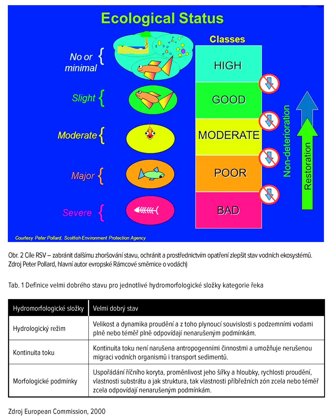 Vstupem do Evropské unie se ČR zavázala k implementaci Rámcové směrnice o vodách (European Commission, 2000, dále RSV) do svého právního řádu. Cílem RSV je zabránit dalšímu zhoršování stavu, ochránit a prostřednictvím opatření zlepšit stav vodních ekosystémů (obr. 2). Stav povrchových vod je podle ní určen ekologickým nebo chemickým stavem, v závislosti na tom, který je horší. Podstatou je stanovení současného stavu vodních toků a v případě nedobrého stavu návrh a realizace opatření k nápravě. Zároveň se v každém vodním útvaru stanovují působící vlivy a dávají se do souvislosti s hodnocením jeho stavu. Ekologický stav je určen na základě stavu biologických složek, hydromorfologických a chemických a fyzikálně-chemických složek. Účelem hodnocení stavu hydromorfologických složek je získání informace, zda hydromorfologické podmínky umožňují dosažení požadované kvality biologických složek a požadovaného ekologického stavu (popř. potenciálu) vodního toku.