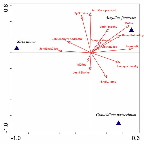 Grafické znázornění výsledků kanonické korespondenční analýzy (CCA) habitatových preferencí zkoumaných druhů sov zjištěných v blízkosti nahrávacích bodů v CHKO Brdy. Výsledky jasně ukazují, že sýc rousný preferující jehličnaté porosty s příměsí doupných listnáčů toleruje také kalamitní holiny, které využívá jako loviště. Veškeré zahrnuté lokality se nacházely v rámci kvadrátů o ploše 1 km2 s převahou jehličnatého lesa. Autor Jan Havelka