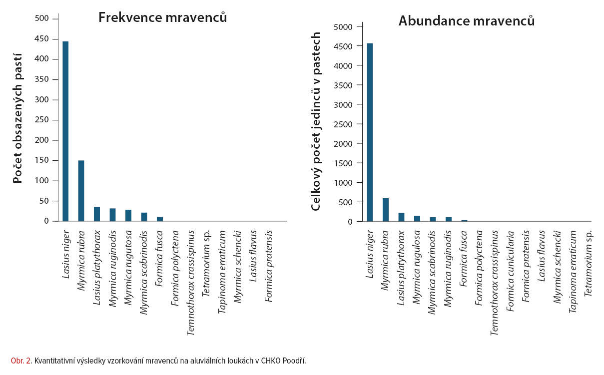 Celkem jsme takto ulovili 15 druhů mravenců v 5 708 jedincích (v průměru 0,45 druhů a 57 jedinců na past), v 905 pastech nebyl žádný mravenec. Ve vzorcích co do celkové početnosti i frekvence (počet pastí s pozitivním záchytem) drtivě převažoval mravenec obecný (Lasius niger), hojný generalista nelesních stanovišť (Obr. 2). Druhý nejhojnější byl mravenec žahavý (M. rubra), preferovaný hostitel modráska bahenního. Z dalších hostitelů modráska jsme ještě zjistili m. rezavého (M. ruginodis), ovšem v podstatně nižších počtech i frekvenci.
