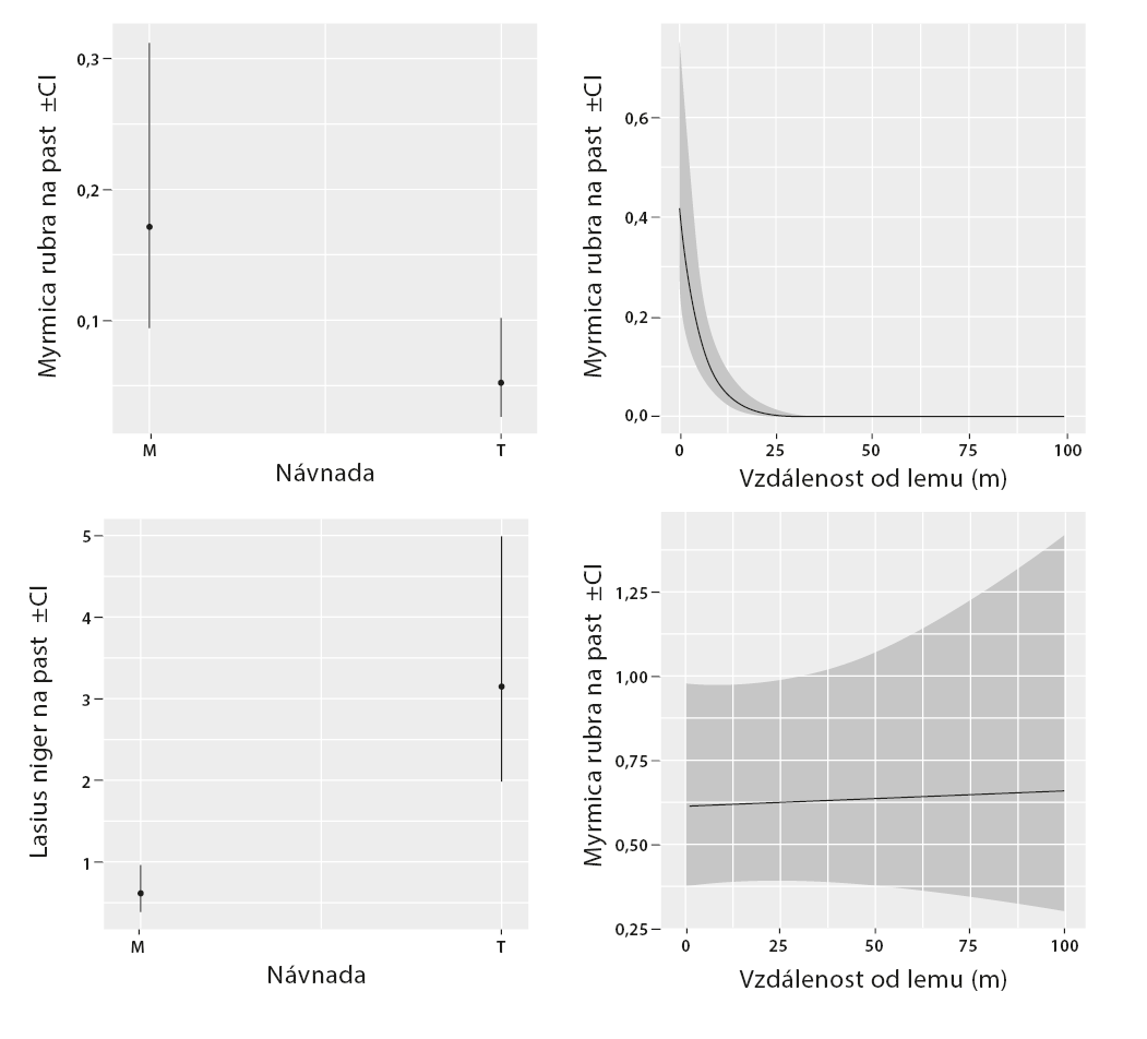 Obr. 3. Grafické výstupy regresních modelů (smíšené lineární modely s identitou louky jako náhodným faktorem a vzdáleností od lemu a typu návnady jako fixními faktory), vztahujících početnost dvou na loukách CHKO Poodří nejhojnějších mravenců, M. rubra (preferovaný hostitel modráska bahenního) a Lasius niger, k typu návnady (M – med, T – tuňák) a vzdálenosti od lemu. Krom zjevně negativního vztahu druhu M. rubra k vnitřním plochám luk vidíme, že Lasius niger preferoval tuňákovou a M. rubra medovou návnadu.