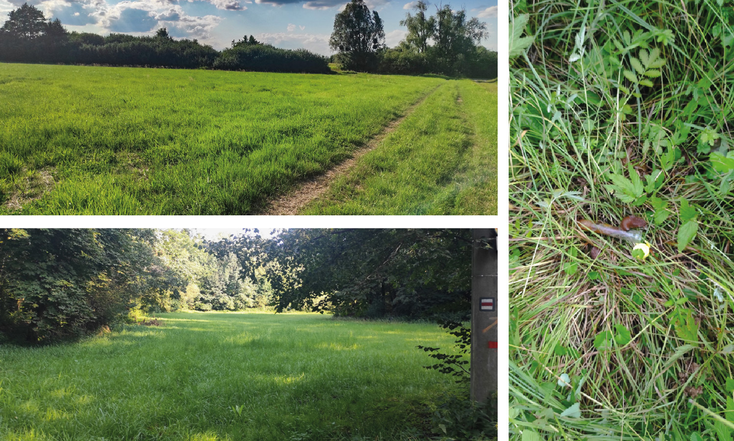 Obr. 1. Vlevo nivní louky v CHKO Poodří – nahoře rozsáhlá uniformně sečená louka nevhodná pro mravence rodu Myrmica, dole drobná loučka obklopená lesními lemy, obývaná mravenci rodu Myrmica i modráskem bahenním. Vpravo návnadová past použitá ke vzorkování mravenců.