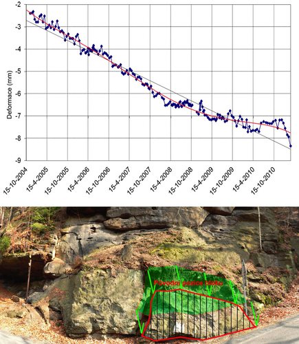 Ruční monitoring je prováděn skalníky, speciálně vyškolenými zaměstnanci skalní čety. Skalní četu tvoří čtyři skalníci rozdělení do dvou skupin, kterým velí jeden geolog. Jedna skupina má na starosti pouze nebezpečné kameny nad obcí Hřensko, druhá skupina pak sleduje vybrané nestabilní skalní svahy ve zbylých částech národního parku. Takto je sledováno 39 lokalit s 270 nebezpečnými objekty, na kterých je osazeno 500 měřičských bodů. Každý bod je nutno proměřit minimálně jednou za 14 dní a v případech, kdy hrozí na daném místě zvýšené nebezpečí, měří se objekt jednou týdně. K ručnímu měření jsou ve skalní četě používány dilatometry, běžně používané ve strojírenství. Měří se vychylování nestabilního kamene od masivní skály a je sledován trend vychylování v průběhu jednoho a více let (Obr. 4). V letních měsících se nestabilní objekt zpravidla k masivu přiklání a v zimních měsících, vlivem zvětšování objemu mrznoucí vody, se od masivu odklání. Zimní i letní výchylka se pohybuje v řádu jednotek milimetrů, v ojedinělých případech i první desítky milimetrů. Rozdíl mezi stabilním a nestabilním blokem je zejména v tom, že stabilní blok se po zimním vychýlení vrátí zpět do původní polohy, kdežto nestabilní blok se do původní polohy nevrací nebo se k masivu přichýlí jen nepatrně. Účelem tohoto sledování je vyhodnocení míry nestability jednotlivých nestabilních objektů, včasné odhalení a eliminace rizika. Velice zajímavý výsledek je ze sledování nestabilní skalní šupiny nad silnicí z Hřenska do Janova u vstupu na Hřenskou vyhlídku. Blok byl zjevně nestabilní, ale vzhledem k tomu, že jeho pádová trajektorie neohrožovala silnici, byl ponechán samovolnému vývoji. Nakonec se blok zřítil a skalní četa jej sledovala až do posledního okamžiku (Obr. 5). Jiná situace byla u nestabilního objektu na lokalitě zvané „Pohovka“ poblíž Rudolfova kamene. Skalní blok byl jednoznačně nestabilní a byl v takové pozici, že přímo ohrožoval červeně značenou turistickou stezku vedoucí z Pohovky ke skalnímu hrádku Šaunštejn. Blok byl vyhodnocen jako bezprostředně nestabilní a bylo přistoupeno k jeho likvidaci řízeným shozem. Souhrnný objem nebezpečného bloku byl přibližně 20 metrů krychlových, to znamená 40 tun, což je na hranici, kterou zvládne skalní četa samostatně zpracovat. K likvidaci bylo využito dílenských rozvíráků, které nestabilní blok mírně vyklonily směrem od svahu, zbytek práce byl ponechán gravitaci.