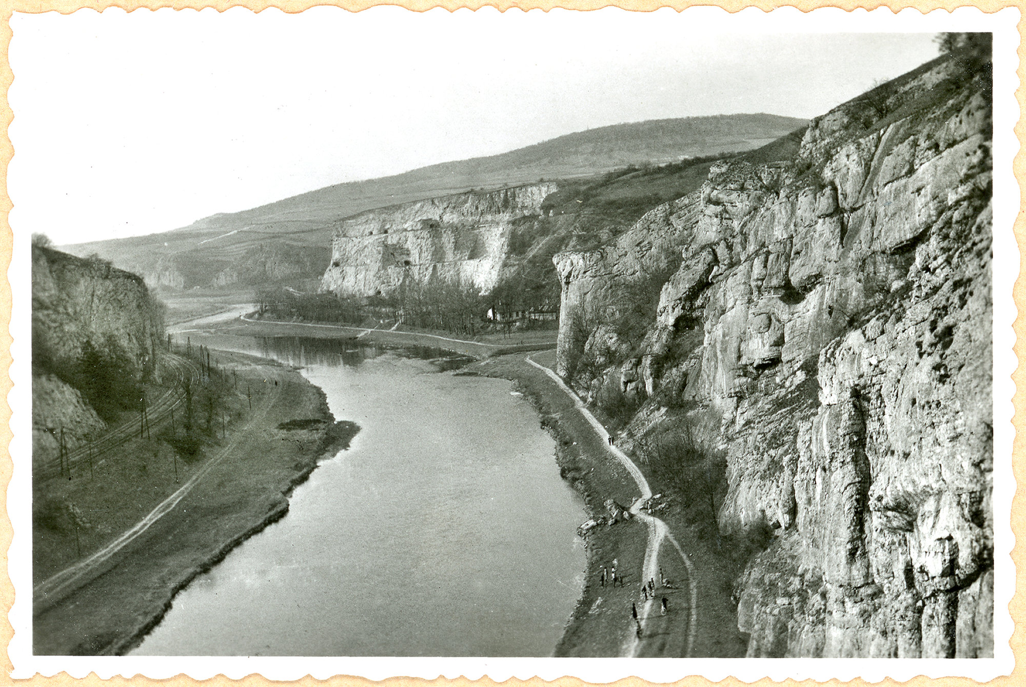 Fotodokumentace jeskynních skupin Českého krasu z archivu Vladimíra Homoly. Dle orig. popisu: Údolí Berounky od Barrandeovy jeskyně. V pozadí synklinála Šanového koutu, uprostřed lom Pražské železářské v Kozlu, před ním Kazatelna. (Sbírka dokumentace SJ ČR, foto Vl. Homola, rok 1943)