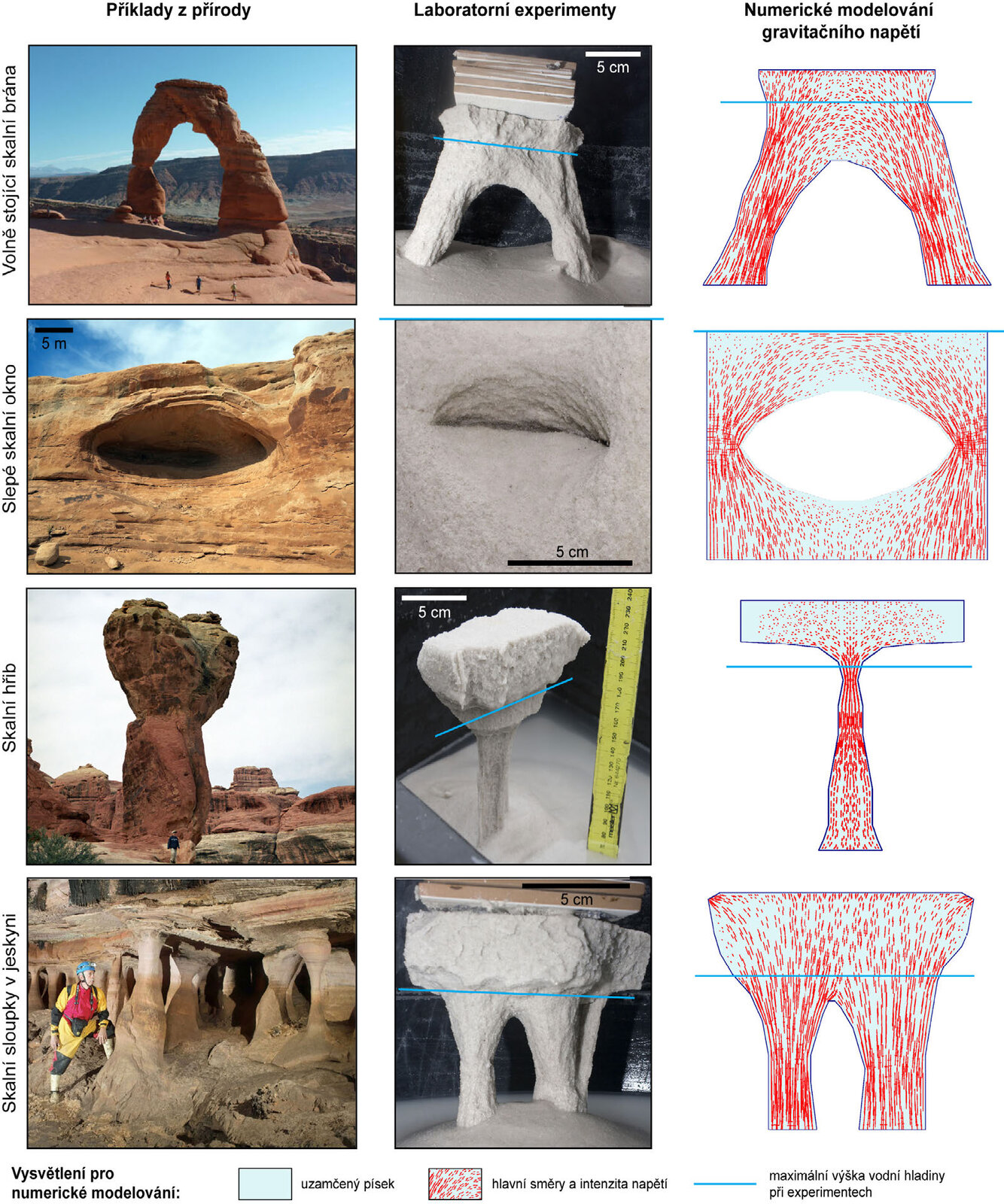 Obr. 3: Ukázky různých pískovcových skalních útvarů v přírodě (vlevo), při experimentu se střelečským uzamčeným pískem (uprostřed) a jako výsledek matematického modelu, kde modrá linie je hladina zaplavení a červené linie ukazují směr a jejich hustota intenzitu horninového tlaku. Převzato z Bruthanse et al. (2014).
