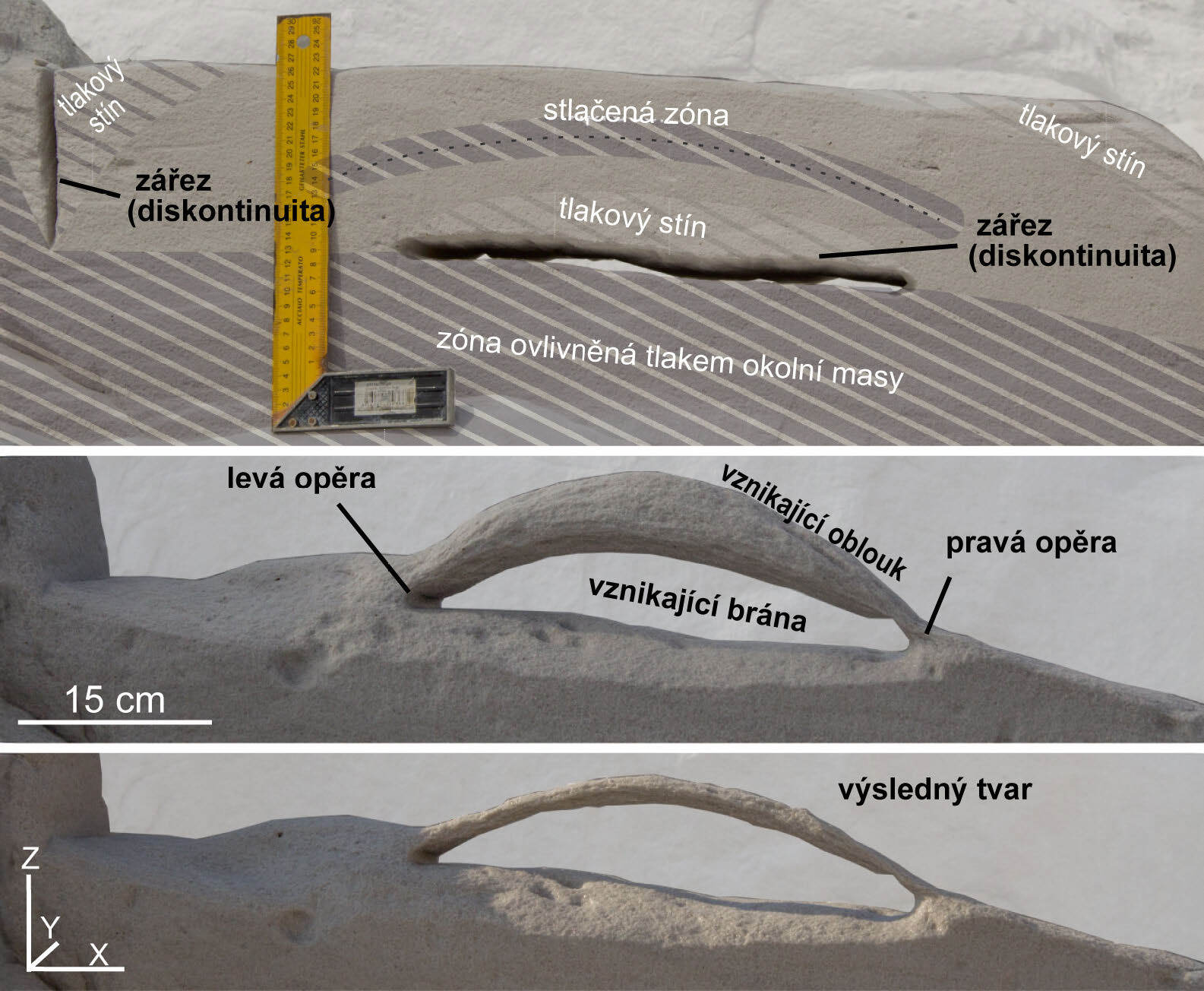 Tyto útvary totiž nevytvořila pouze „bezduchá“ eroze. Nejsou dílem náhody. Naopak. Cosi erozi skal evidentně řídí a diriguje. Proto jsou útvary tak elegantní, není na nich žádný balast, skalní brány jsou hladké a vše, co nepřenáší váhu, zmizelo, zůstal jen dokonalý oblouk. Kdo nebo co je tím dirigentem? Experimenty ukázaly, že to není žádná nadpřirozená bytost. Dirigentem je gravitací vyvolaný tlak v hornině. Jednotlivá zrna na sebe tlačí a tlak provazuje miliardy zrn do jediného interagujícího „organismu“ – skalního útvaru. Cokoli se v jedné části útvaru stane, odrazí se i ve zbytku. V částech, kde je horninový tlak velký, eroze neúčinkuje nebo postupuje pomalu. Je to stejně marné jako vytahovat knihu ze spodní části obrovského sloupce knih. Nejde to. Naopak ty části útvaru, které tlak nepřenáší, se erodují snadno, stejně jako je snadné vytáhnout knihu, na které leží jen několik málo knih. Ačkoli pískovec je jen neživá hornina, vlastně se chová chytře a úsporně: nechává erozi odnášet ty části, co nenesou žádnou váhu (balast), čímž se preparují nosné prvky (oblouky, sloupy apod.). Tím se skála (skalní forma) stává stabilnější. Ze střelečského uzamčeného písku se pouhým namáčením ve vodě či kropením vodou podařilo vytvořit všechny hlavní útvary známé z pískovcových národních parků (Obr. 3). Tyto útvary vznikají samy od sebe, vynořují se postupně, jak voda odnáší zrna písku. Co trvá v přírodě statisíce let a člověk to nemůže pozorovat, vytváří se ze střelečského uzamčeného písku během pár hodin. Díky střelečskému uzamčenému písku můžeme při experimentech ve zrychlené podobě pozorovat fascinující vývoj od ošklivých hranatých tvarů k dokonalosti zmenšených skalních forem. Více informací o vzniku těchto skalních útvarů je v těchto článcích: Bruthans et al. 2014, Bruthans 2014, Filippi 2014, Řihošek et al. 2019, Filippi et al. 2021.