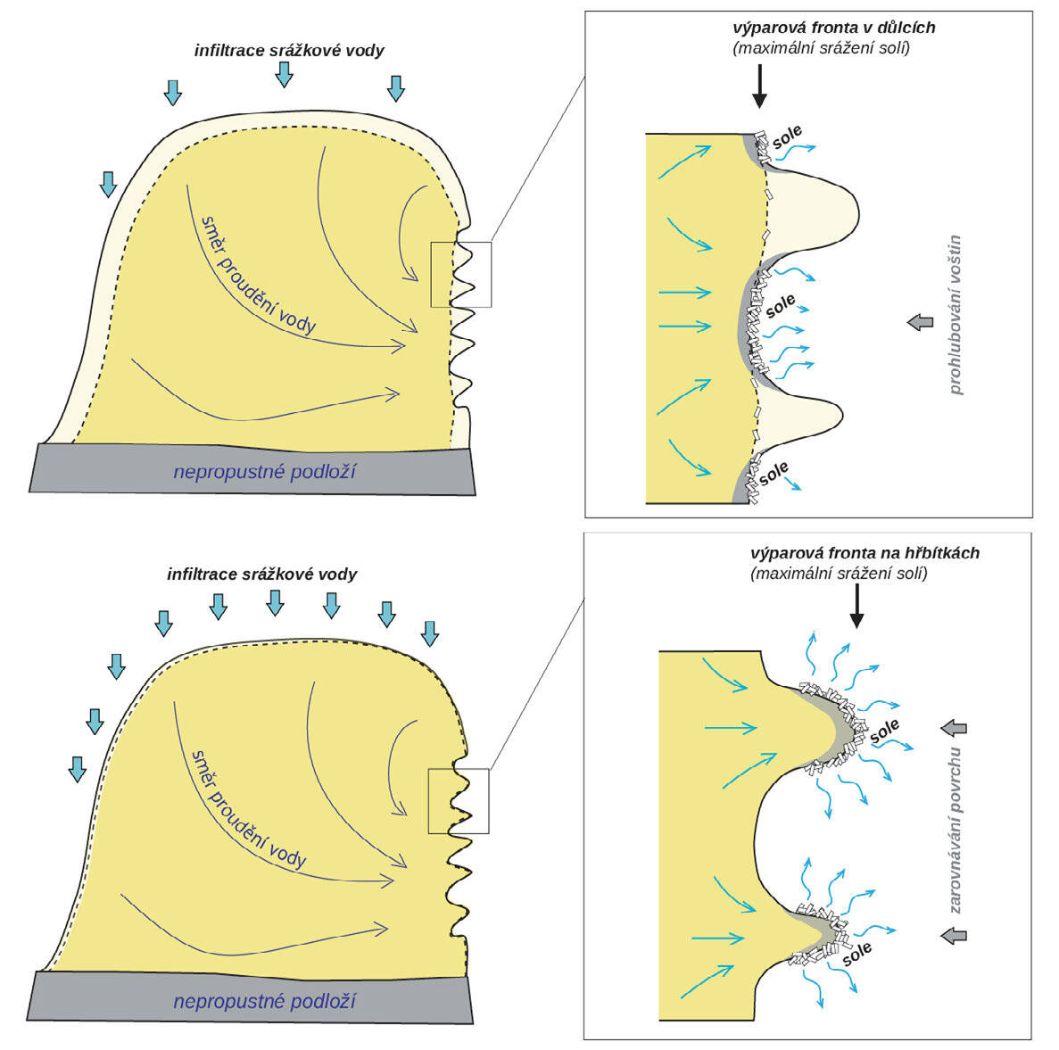 Obr. 5: Schéma vzniku voštin (nahoře) a zarovnávání povrchu při přílišném množství vody (dole) (převzato z Bruthanse et al., 2018, (upraveno).