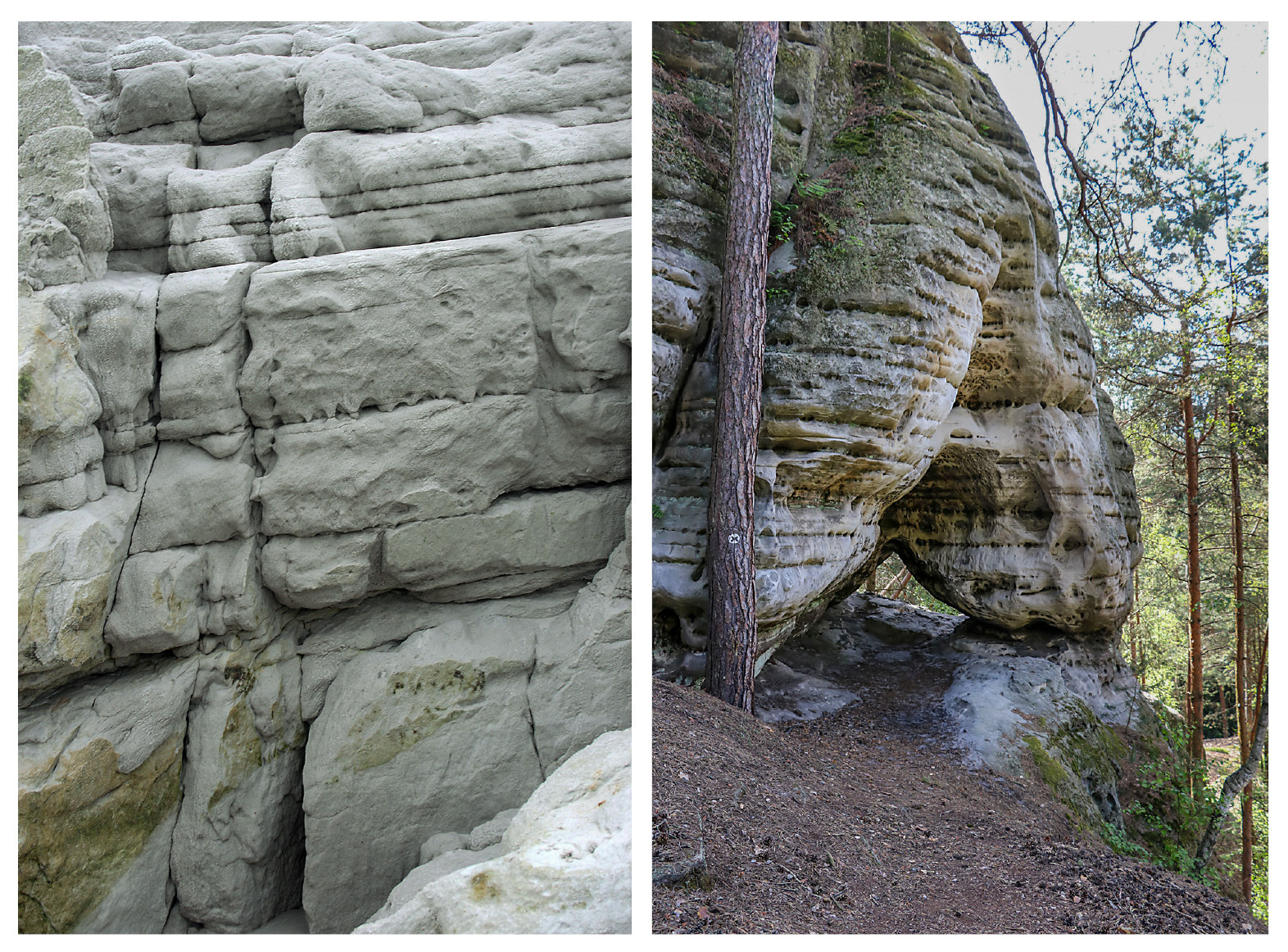 Obr. 1: Střelečský uzamčený písek v lomu (vlevo) a na přirozených výchozech ve skalním městě Apolena (vpravo). Foto Michal Filippi