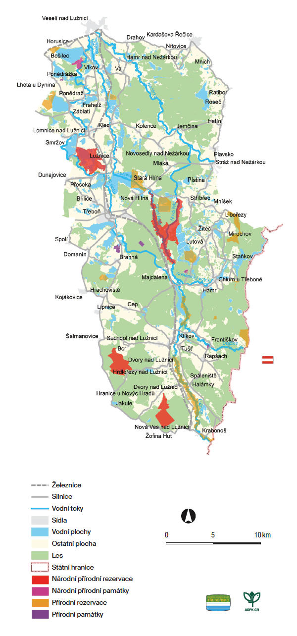 Na říční osu Třeboňska – řeku Lužnici a její unikátní přírodní nivu – od státní hranice s Rakouskem až po rybník Rožmberk jsou vázány PR Krabonošská niva, PR Horní Lužnice, PR Na Ivance, NPR Stará a Nová řeka a PR Výtopa Rožmberka, přičemž celé území je součástí rozsáhlé EVL Třeboňsko-střed. Je ho možno nazvat skutečným mokřadním srdcem Třeboňska. Mezi předměty ochrany patří přirozené lesní porosty tvořené především společenstvy mokřadních olšin, mokřadních vrbin a tvrdého luhu (lužní lesy s dubem letním a střemchou obecnou v střídavě zaplavované části říční nivy), vlhkých a borových doubrav a dále aluviální mokřady tvořené společenstvy poříčních slepých ramen a tůní a jejich bahnitých břehů, pobřežních rákosin a vysokých ostřic. Mezi botanické předměty ochrany patří např. žebratka bahenní (Hottonia palustris), ďáblík bahenní (Calla palustris) bublinatka běložlutá (Utricularia ochroleuca) či leknín bělostný (Nymphaea candida). Z bezobratlých jsou to např. motýl bělopásek tavolníkový (Neptis rivularis), vážka klínatka rohatá (Ophiogomphus cecilia) a již zmínění brouci vázaní na staré stromy. Z ryb je možno uvést piskoře pruhovaného (Misgurnus fossilis) nebo sekavce (Cobitis sp.). Vyskytuje se zde minimálně 7 druhů obojživelníků a 5 druhů plazů. Území je jádrem výskytu vydry říční (Lutra lutra), jejíž populace na Třeboňsku se odhaduje na 150 zvířat.