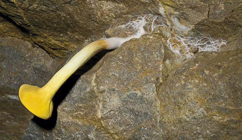 Na skalní stěně svrchního patra občas vyroste mykorhizní houba klouzek zrnitý (Suillus granulatus). Dané místo je mělko pod povrchem, kde roste jak borovice černá, tak borovice lesní, takže lze předpokládat blízkost jejich kořenů. Foto in situ, 13. 3. 2010.