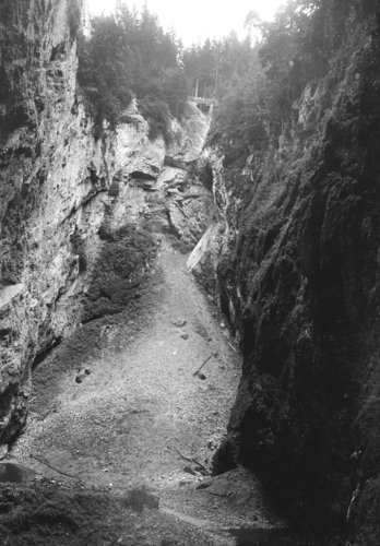 Obr. 2: A – Soutěska „Horní úzká“ v Suchém žlebu na počátku 20. století.