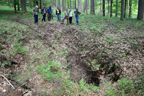 Jeden z velkých závrtů v lesním komplexu pod Brusnou, který byl nově