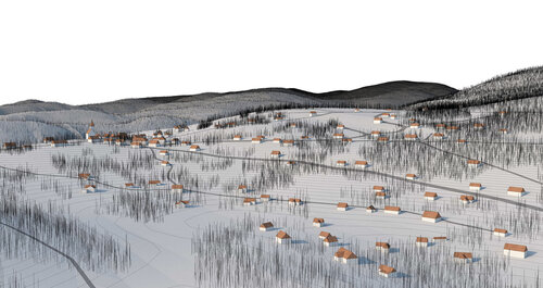 Různé charaktery krajin a tomu odpovídající urbanistické struktury: Nahoře: kompaktní vesnice s návsí v nížinných oblastech; Dole: rozvolněná zástavba chalup typická pro horské oblasti. Prezentované záměrně formou schémat upozaďujících detaily. Zde by mělo vyniknout, jak se oblasti z celkového pohledu liší. (Urbanistická schémata Jan Vybíral).